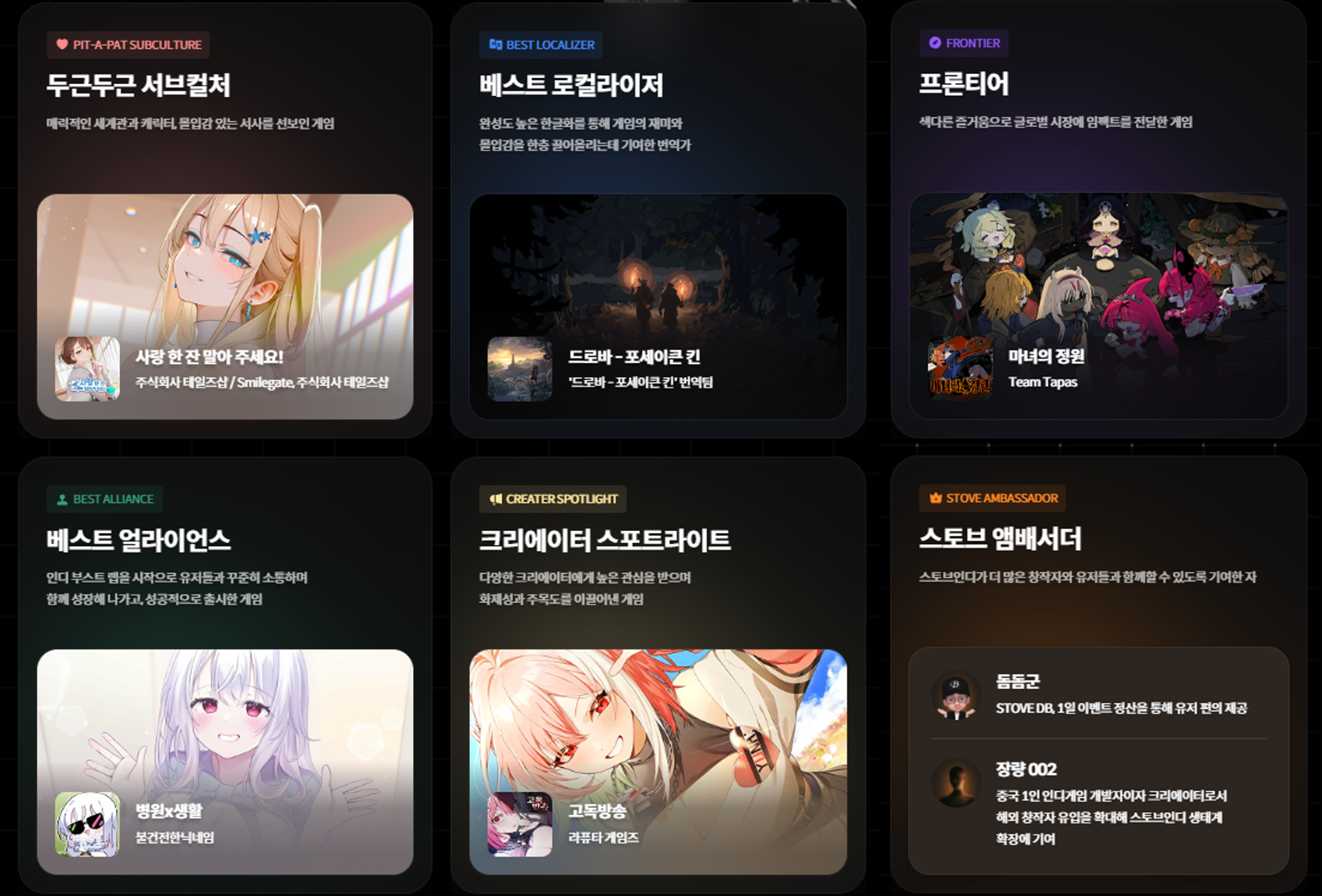 '프론티어' 부분에서는 글로벌에서 임팩트를 보여준 <마녀의 정원>, '스토브 엠배서더'에는 유저 편의 기능을 제공한 스토브 유저 '돔돔군'과 해외 창작자의 입점에 기여한 중국의 1인 개발자 '장량002'가 선정되었습니다. |
